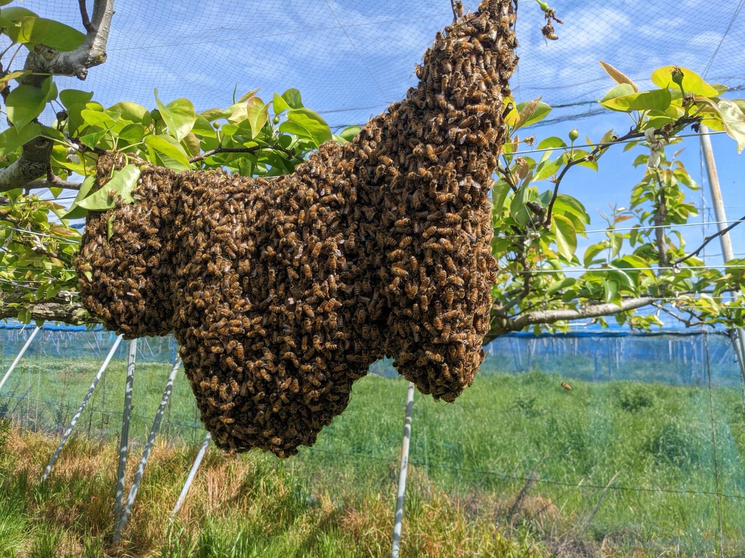 授粉のために梨園に入れていたミツバチが分蜂(巣別れ)してしまいました。 今頃の時期、ミツバチは盛んに新しい王をつくって巣別れしようとするので、週に一回は巣箱を開けてその兆しがないかチェックしなければならないのですが、その作業が遅れて分蜂されてしまいました。 幸いうちの梨園の中だったので大きな騒ぎにはならず無事回収できましたが、こんなのが民家の軒先のにできていたらびっくりしますよね。 よかったです。