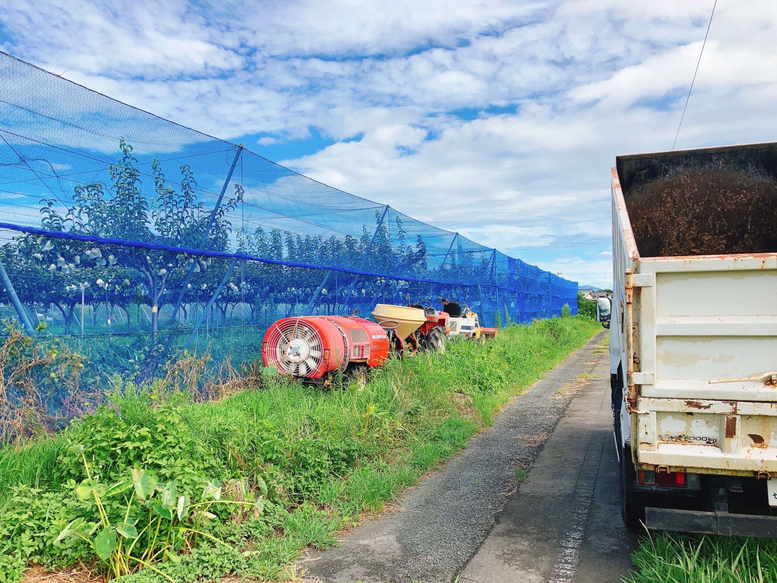 台風7号による強風で梨の落果を少しでも防ぐために機械を風上に並べて風よけにしました。