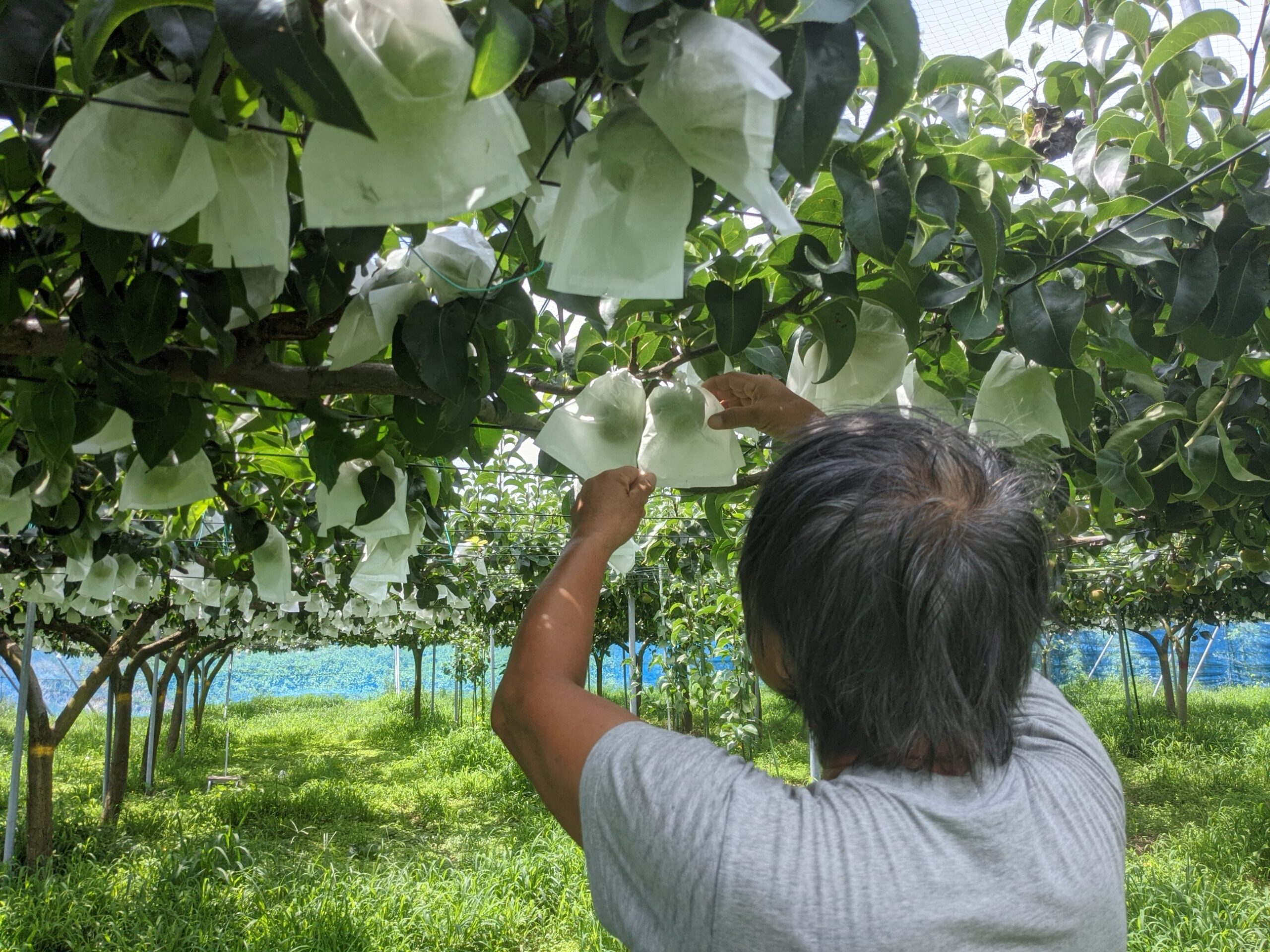 はんぺん農園は通常梨の袋掛けは行わないのですが、『秋麗』だけは袋を掛けます。 秋麗は果皮が弱く、無袋では果実の外観が汚くなるだけでなくカメムシの被害も激しくなります。